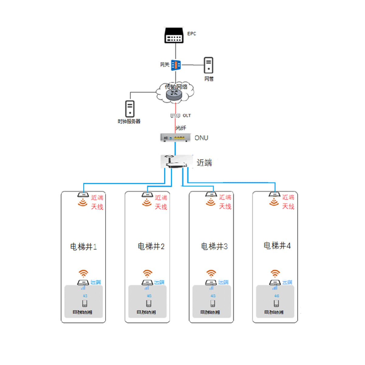 通过安装在电梯井顶部1副5GHz WiFi天线往下覆盖电梯井。可支持通过以太网口扩展实现一拖四组网,覆盖4部电梯;近端集成5GHz WiFi网桥和路由,ONU(可选)功能。